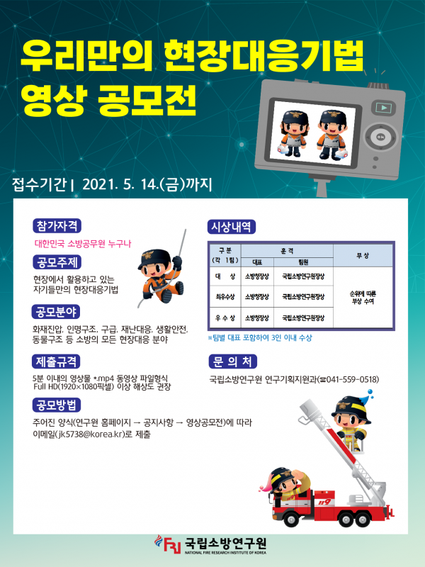 대한민국 소방공무원이면 누구나 참여할 수 있고 출품작은 5분 이내의 동영상으로 표현되어야 하며 5월 14일까지 전자우편으로 국립소방연구원에 제출하면 된다.