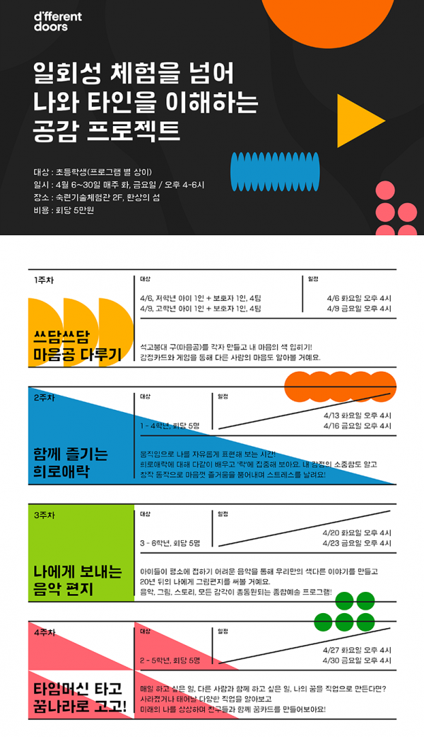 4월의 공감하기 워크숍은 가족을 대상으로 하는 만들기 명상 ‘쓰담쓰담 마음공 다루기’, 감정을 몸으로 표현하고 협업놀이를 하는 ‘함께 즐기는 희노애락’, 20년 후의 나를 상상하며 음악과 그림을 그려보는 ‘나에게 보내는 음악편지’, 내가 좋아하는 일을 직업으로 만들어보는 ‘타임머신 타고 꿈나라로 고고’가 있으며 1회 또는 다 회로 신청할 수 있다.