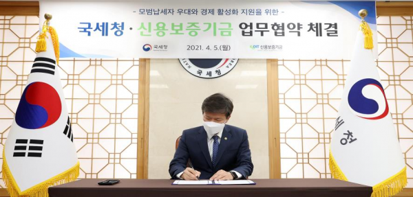 [충청뉴스큐] 국세청은 모범납세자에게 신용보증 우대혜택 등을 제공하기 위해 '21.4.5. 신용보증기금과 업무협약을 체결했다.
