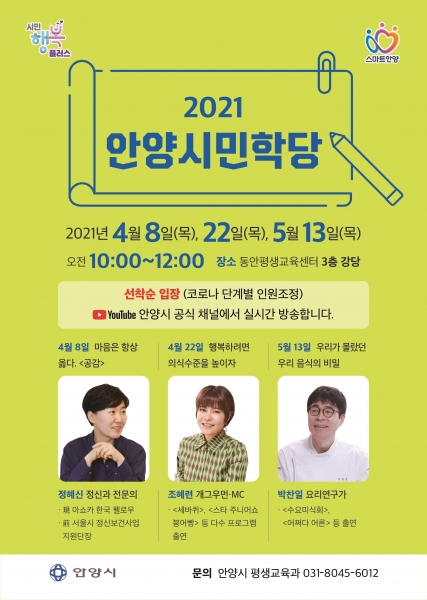 [충청뉴스큐] 안양시의 명사 초청 강연 ’안양시민학당‘이 봄과 함께 4월 강좌를 시작, 온오프라인으로 시민들을 찾아간다.