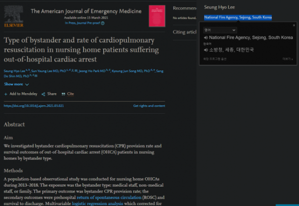 [충청뉴스큐] 소방청은 소속 구급대원이 제1저자로 참여한 연구논문이 응급의학 분야의 세계적인 학술지 AJEM 최신호에 게재됐다고 밝혔다.