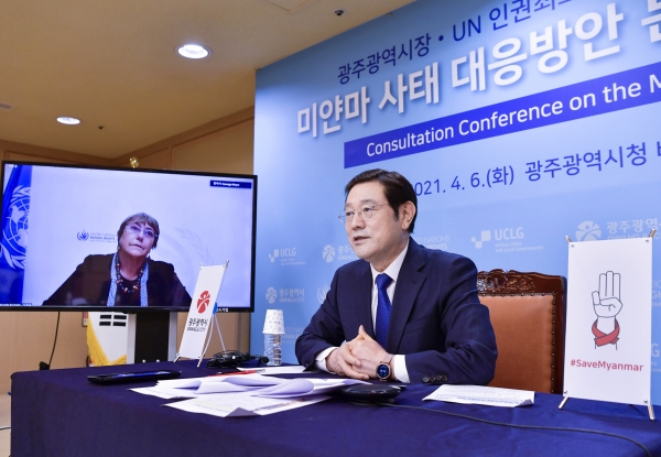 [충청뉴스큐] 광주광역시와 유엔 인권최고대표사무소, 세계지방정부연합은 6일 오후 화상회의를 갖고 미얀마 군부 쿠데타 반대와 민주화운동 지지, 미얀마 국민 인권보호를 촉구하는 세계지방정부연합 차원의 공동 성명서를 발표하기로 합의했다.