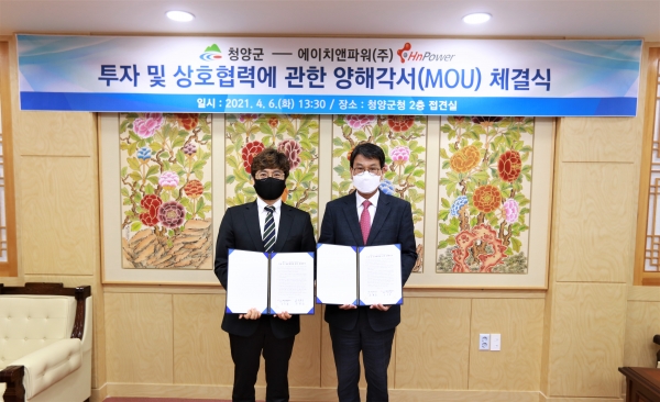 [충청뉴스큐] 비봉면 신원리 일원에 신규 일반산업단지 조성을 추진하는 청양군이 지난 6일 수소연료전지 생산업체 에이치앤파워와 친환경 산단 조성을 위한 양해각서를 체결했다.