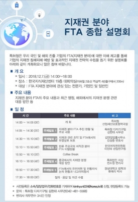 이번 설명회는 우리나라와 FTA를 체결한 국가가 57개국에 달할 정도로 확대되고 신흥국과의 FTA도 지속 추진되는 상황에서, 해외에 진출해 있거나 진출을 희망하는 우리 기업들이 지재권 분야 FTA의 내용을 이해하고 적극 활용토록 하기 위하여 마련됐다.