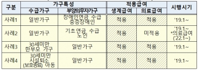 이에 따라 만 30세 미만의 한부모 가구와 보호종결아동은 부양의무자 기준 적용 없이 본인 가구의 소득인정액이 각각의 선정기준을 충족시, 생계급여와 의료급여를 지원받을 수 있게 된다.