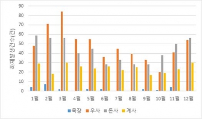지난 3년간 전국에서 발생한 축사 화재는 1,460건으로, 총 675억 원의 재산 피해가 발생했으며, 겨울로 접어드는 10월부터 발생 건수가 꾸준히 늘었다.