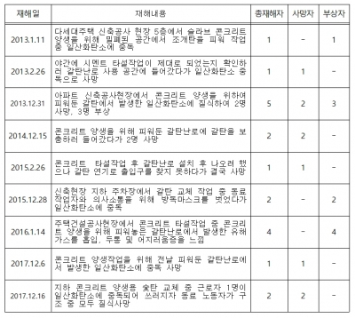 최근 5년간 겨울철에 발생한 질식재해는 총 30건이며 이중 9건이 건설현장에서의 갈탄난로 사용에 의한 것으로 겨울철 가장 많이 발생하는 질식재해 유형이기도 하다.