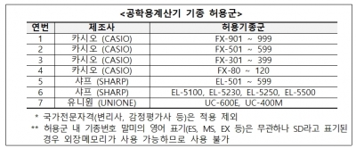 네 가지 등급에 응시하는 수험자는 허용군 외 공학용계산기의 사용이 가능하나 시험 전 계산기 매뉴얼 등을 확인해 직접 계산기를 초기화하고 감독위원 확인 후 사용 가능하다.