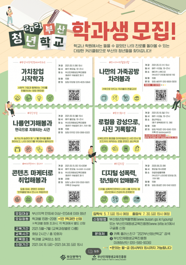 [충청뉴스큐] 부산시는 상·하반기 각 6개 학과로 나눠 운영되는 ‘2021년 부산청년학교’의 상반기 학과에 관심 있고 수업 참여를 희망하는 청년 학과생을 4월 16일부터 모집한다고 밝혔다.