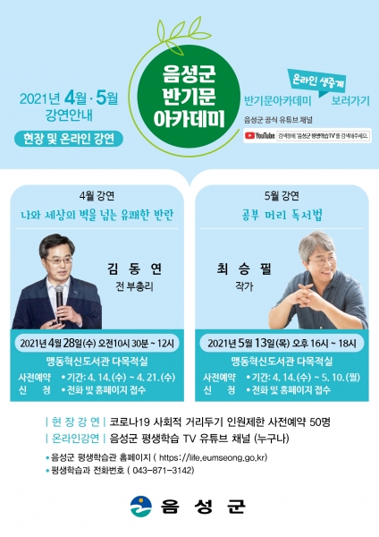코로나19에 따른 사회적 거리두기를 지키기 위해 현장 강연은 사전예약을 통해 신청한 50명으로 인원을 제한하고 ‘음성군 평생학습 TV’ 유튜브 라이브를 통해 누구나 강연을 들을 수 있도록 할 계획이라고 전했다.