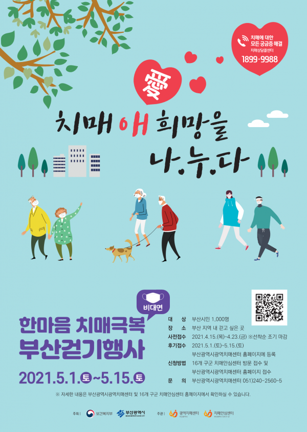 올해 처음 시도하는 비대면 걷기 행사는 부산시가 주최하고 부산광역치매센터 및 16개 구·군 치매안심센터가 공동 주관한다.