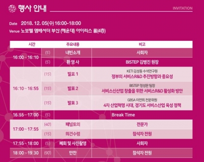 이를 위해 전자부품연구원 김성동 수석연구원과 부산과학기술기획평가원 정성문 서비스 R&D팀장, 그리고 경기도경제과학진흥원 이연희 전문위원이 ‘정부의 서비스R&D 추진방향과 중요성’, ‘서비스신산업 창출을 위한 서비스R&D 활성화 방안’, ‘4차 산업혁명 시대, 경기도 서비스산업 육성 정책’이란 주제로 발표를 하고, 옥영석 부경대 교수를 좌장으로 산업 전문가들의 패널토의가 이어진다.
