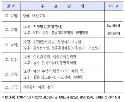 또한 ETRI, 으능정이, 전통문화체험 등 대전의 명소탐방과 더불어 충남 공주의 한옥마을, 예산의 수덕사, 스파체험 등 대전 인근 관광지 방문을 통해 대전 의료관광의 매력을 직접 체험할 예정이다.