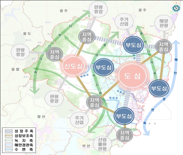 중심지 체계는 2030년 도시기본계획의 ‘1도심 4부도심 7지역중심’에서 ‘영남권 그랜드 메가시티 중심도시 울산’을 목표로 ‘2도심 4부도심 5지역중심’으로 개편됐다.