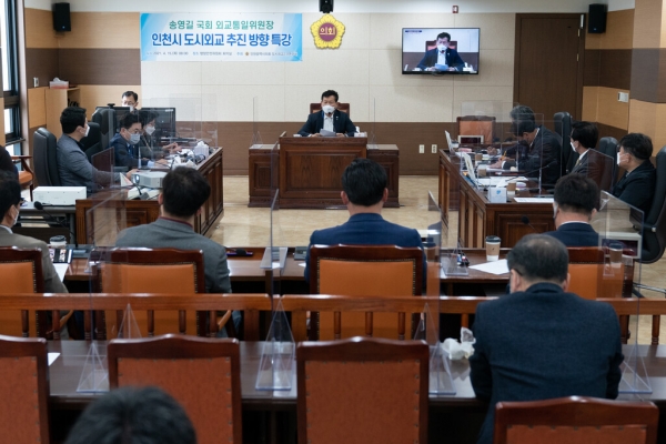 인천시 도시외교 추진 방향을 찾고자 마련된 이번 특강에는 연구단체 대표인 손민호 의원을 비롯해 조성혜·노태손·박종혁 의원이 자리했고 동시에 ZOOM 비대면 방식으로 다수의 시의원과 구의원 등도 함께 특강을 들었다.