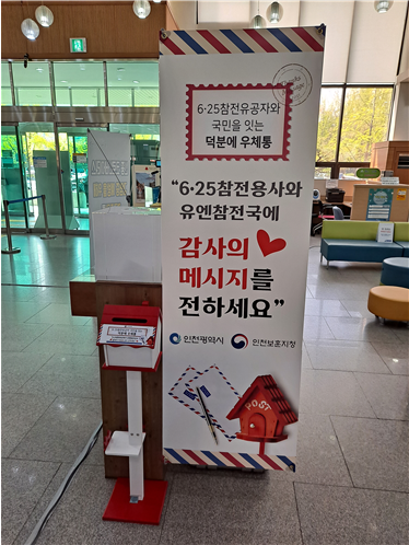 [충청뉴스큐] 인천광역시는 오늘의 대한민국을 있게 한 6.25참전유공자와 유엔참전국의 희생과 헌신에 존경과 감사의 분위기를 조성하고자 인천보훈지청과 긴밀한 협업을 통해 참전유공자와 국민을 잇는‘덕분에 우체통’을 전국 특·광역시 중 최초로 제작해 설치했다고 밝혔다.
