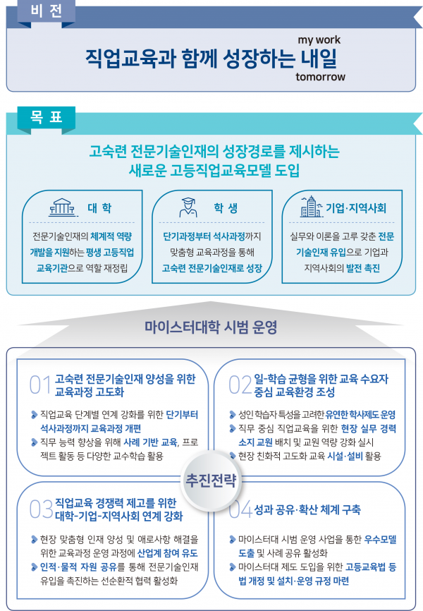‘고등교육법’ 개정으로 전문대학에 전문기술석사과정을 설치·운영할 수 있는 제도적 기반도 마련되어 마이스터대 성과가 기대되는 상황이다.