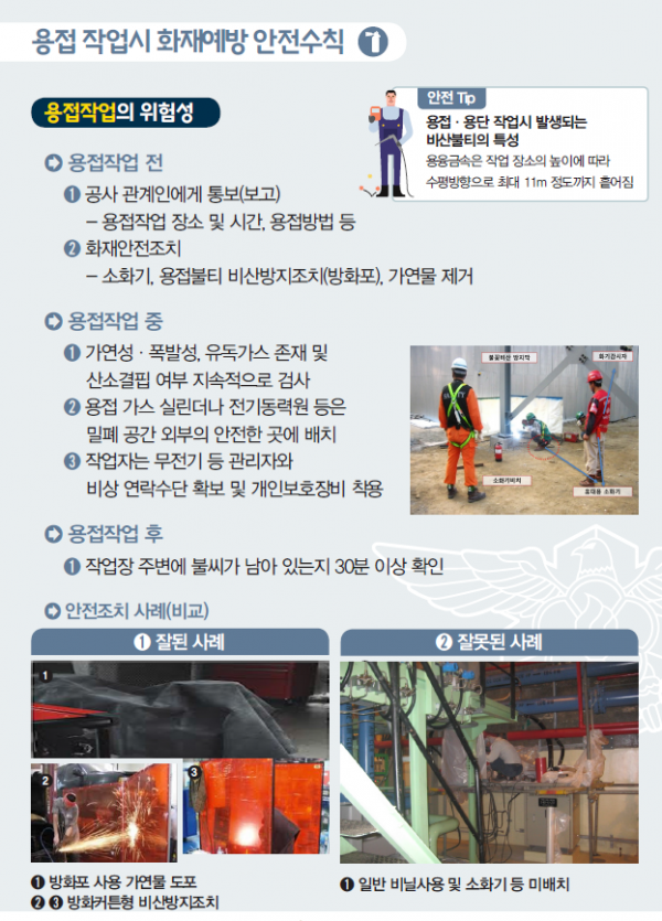 한편 소방청은 용접·용단 등 화재위험작업시 화재예방수칙을 철저히 준수할 수 있도록 대형 공사장에 대한 소방서장의 현장지도를 강화하고 불시단속도 추진한다.