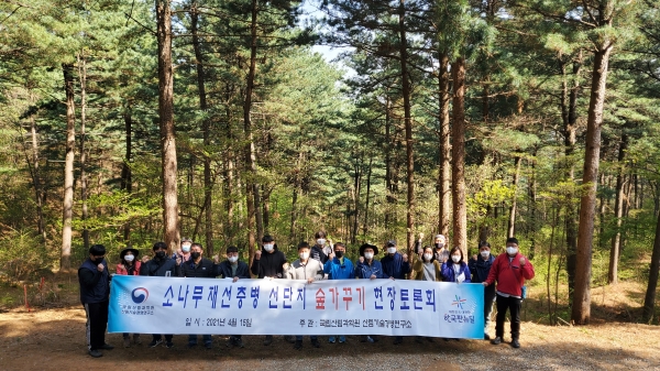 [충청뉴스큐] 산림청 국립산림과학원은 소나무재선충병 피해를 입은 선단지 주변 숲가꾸기 활성화 방안 마련을 위해 4월 15일 경기도 포천시 광릉산림과학연구시험림에서 ‘소나무재선충병 선단지 숲가꾸기 현장토론회’를 개최했다.