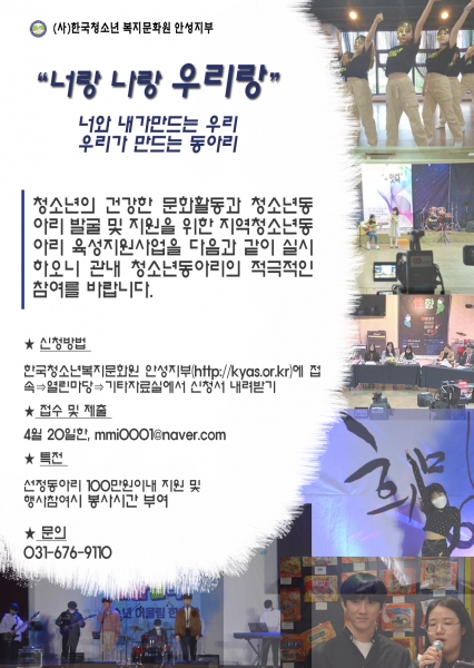 여성가족부와 안성시가 주최하는 청소년동아리활동 지원 사업은 안성시 청소년들의 자발적 청소년 활동인 ‘청소년 어울림마당’을 통해 동아리 간 폭넓은 교류와 청소년들의 문화적 감성, 다양한 특기 개발 및 인성, 사회성을 함양할 수 있도록 지원한다.