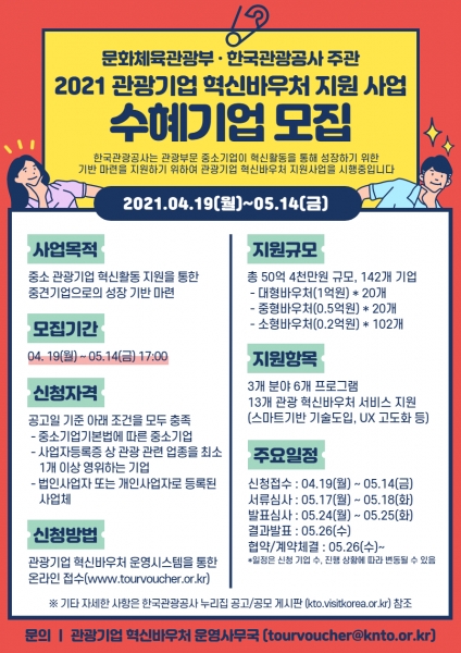 [충청뉴스큐] 문화체육관광부와 한국관광공사는 작년에 이어 ‘2021년도 관광기업 혁신바우처 지원사업’ 수혜기업을 오는 5월 14일까지 모집한다.