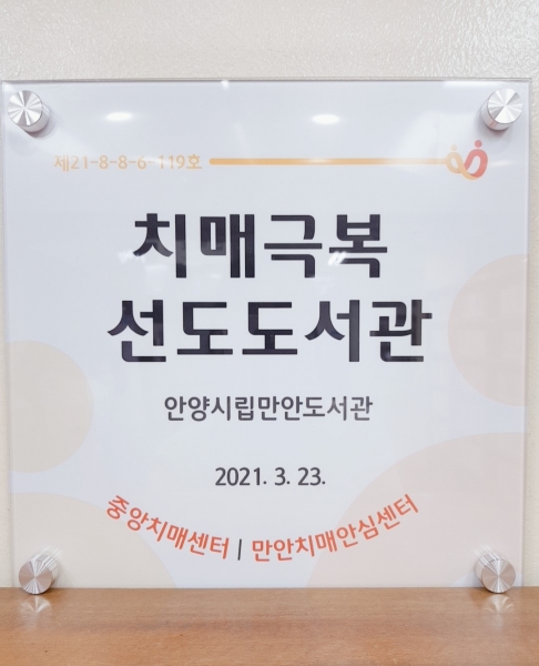 4월 14일 만안구 보건소를 통해 ‘치매극복 선도도서관’ 현판을 수령해 설치한 만안도서관은 2층 종합자료실에 치매극복 도서 코너를 마련해 치매 극복과 관련된 도서와 홍보물, 간행물을 비치하고 있다.