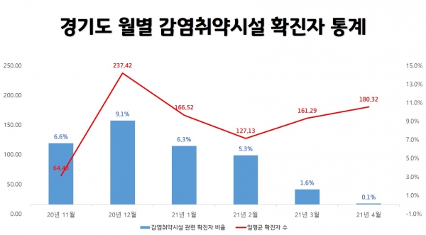 지난해 11월 이후 주 평균 일일확진자 대비 감염취약시설에서의 확진자 비율을 보면 11월 6.6%, 12월 9.1%에서 올해 1월 6.3%, 2월 5.3%, 3월 1.6%로 떨어졌다.