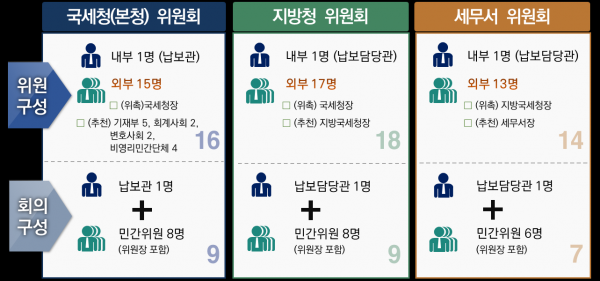 ‘납세자보호위원회’는 민간위원을 중심으로 구성하는 한편 위원장 역시 민간위원 중에서 위촉하는 등 독립적으로 운영되며국세행정 집행과정에서 납세자의 정당한 권리가 침해되는 경우 공정한 심의를 통해 적극 시정하고 있다.