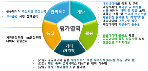 2020년도에는 공공데이터 관리체계, 개방, 활용, 품질, 기타 5개 영역을 평가했으며 특히 사용자 의견수렴을 통한 신규데이터 개방 등 개방 영역의 비중을 높여 수요자 중심의 공공데이터 제공을 위한 기관의 노력과 성과를 중점적으로 평가했다.