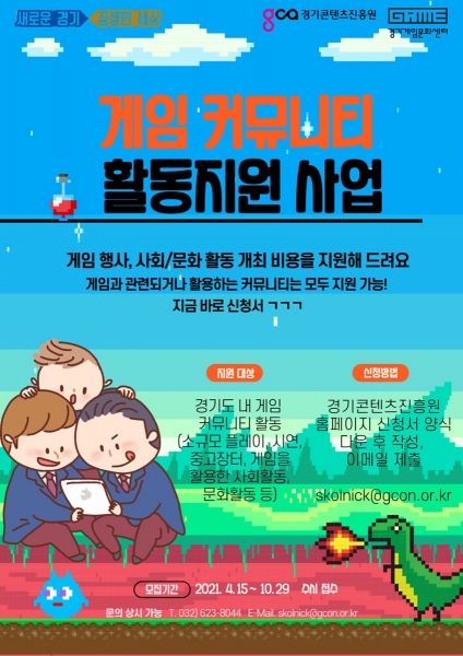 참가를 희망하는 커뮤니티는 10월 29일까지 주관기관인 경기콘텐츠진흥원 홈페이지 사업공고 게시판을 통해 지원할 수 있다.