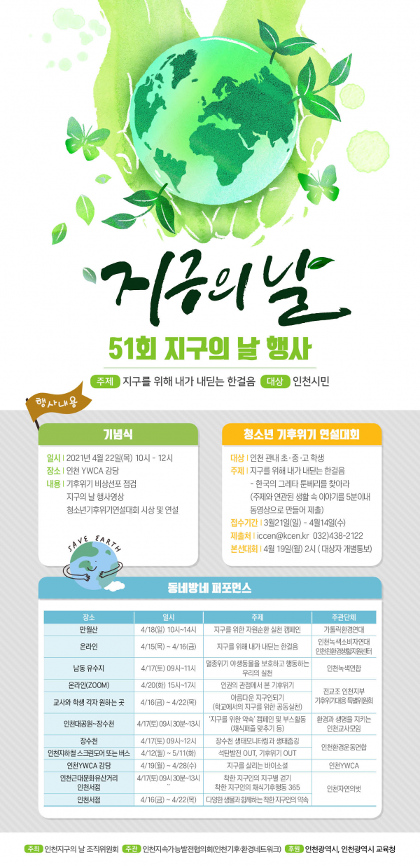 [충청뉴스큐] 인천광역시는‘51주년 지구의 날’을 계기로 탄소중립을 행동으로 옮기는 출발점을 알리고 탄소중립 공감대 마련 및 기후행동 확산을 위해 다양한 시민 참여형 행사를 진행한다고 밝혔다.