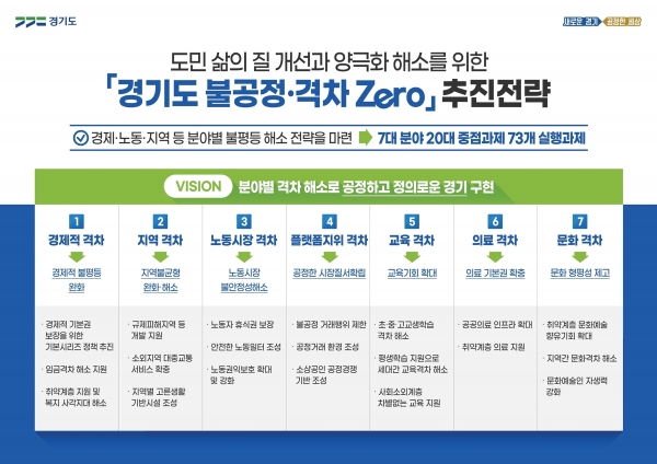 이날 발표된 ‘경기도 불공정·격차Zero 전략’은 ‘분야별 격차해소를 공정하고 정의로운 경기 구현’이라는 비전 아래 7대 분야, 20대 중점과제, 73개 실행과제로 구성됐다.