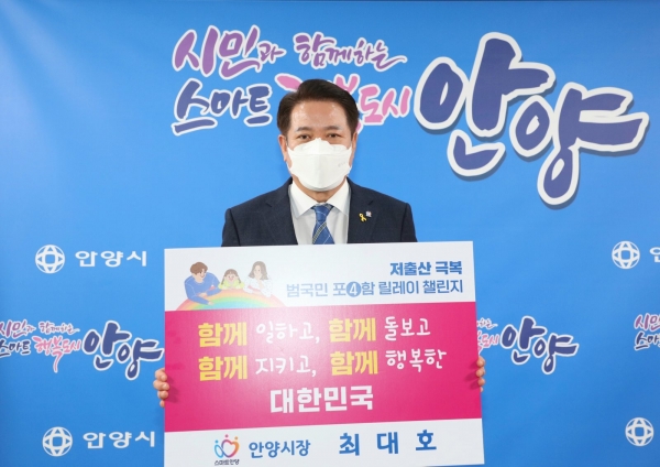 [충청뉴스큐] 최대호 안양시장이 21일 개인 SNS를 통해‘저출산 극복 함께해요 범국민 포함 릴레이 챌린지’동참을 선언했다.