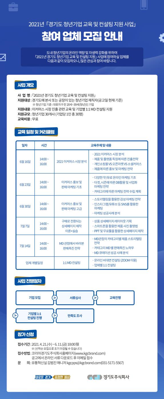 경기도주식회사는 이 같은 내용의 ‘2021년 경기도 청년기업 교육 및 컨설팅 지원’ 사업을 추진, 전자 상거래 관련 교육 및 컨설팅이 필요한 청년기업을 모집한다고 21일 밝혔다.