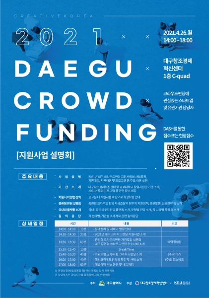 ‘대구 크라우드펀딩 지원사업’은 창업기업과 예비 창업자의 초기 자금조달, 시장검증, 마케팅 및 판로개척을 위한 크라우드펀딩 오픈을 지원하기 위해 대구시가 2017년부터 대구창조경제혁신센터, 경북대학교 창업지원단과 함께 추진 중인 사업이다.