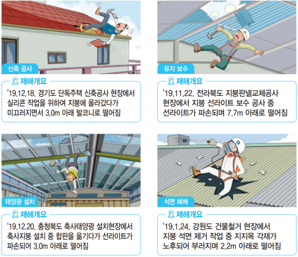 고용노동부는 최근 5년간 지붕공사 중 183건의 추락 사망사고가 발생했으며 올해에도 4.20.까지 지붕공사 중 11건의 추락 사망사고가 발생했다고 밝혔다.