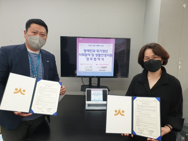 [충청뉴스큐] 수원시지속가능도시재단 청년지원센터는 21일 발달장애인 및 장애인 청년과 위기 청년의 사회참여 및 생활안정을 지원하는 생태계를 조성하기 위해 사단법인 공감연대와 업무협약 체결을 추진했다.