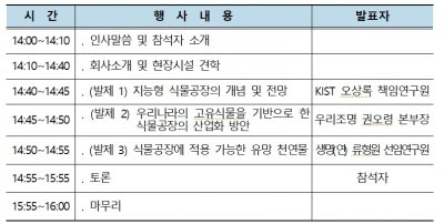 현장에서는 우선 한국과학기술연구원, 한국생명공학연구원 등에서 진행 중인 식물공장 관련 연구 동향 및 유관 기업들의 산업화 현황이 소개되었고, 기능성 천연물 재배를 위해 투자 의향이 있는 기업과 연구 역량을 갖춘 연구소 간 공동연구가 필요하다는 의견이 제시되었으며, R&D와 병행하여 인·허가 지원, 제도 개선, 인프라 구축 등의 정책 방안도 같이 논의됐다.