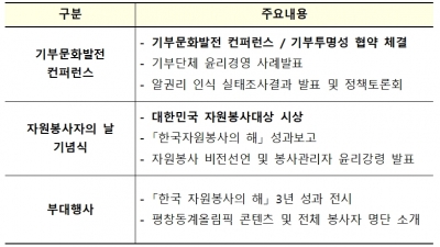 이번 대회에서는 ‘자원봉사자의날 기념식’을 통해 자원봉사의 숭고한 가치를 되새기는 한편, 우리사회에 건전 기부문화를 확산하기 위한 ‘기부문화발전 컨퍼런스 및 기부투명성 협약식’이 함께 진행된다.