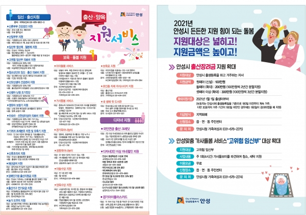 [충청뉴스큐] 안성시는 출산율 저하에 따른 사회문제 대응과 임신 및 출산 가정의 경제적 부담 완화를 위한 저출산 대책의 일환으로 ‘임신출산양육 관련 서비스’ 통합 홍보물을 제작해 배부했다고 22일 밝혔다.