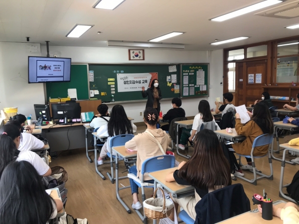 [마음 톡톡 성인지 감수성] 교육은 청소년들의 성인지 감수성을 높이고 올바른 성 가치관과 태도 함양을 목적으로 이번 교육은 코로나19로 방역지침 준수사항을 지켜가며 각 교실 내에서 전문 강사와 함께 진행했다.