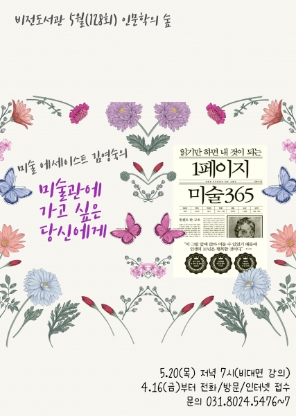 다음달 5월 20일 저녁 7시에 온라인으로 진행되는 128번째 인문학 강좌에서는 미술 에세이스트로 활동 중인 김영숙 작가를 초청, ‘미술관에 가고 싶은 당신에게’를 주제로 작품, 미술사, 화가, 장르 등 여러 측면에서 꼭 알아야 할 미술의 교양을 함께 나눠볼 예정이다.