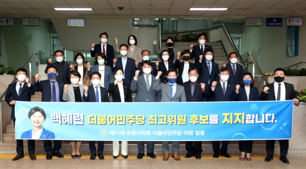 [충청뉴스큐] 수원시의회 더불어민주당 소속 의원들은 22일 제359회 임시회 제2차 본회의 종료 후, 더불어민주당 최고위원에 도전한 백혜련 국회의원 후보 지지를 선언했다.