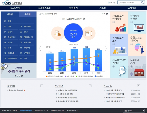 앞으로도 국세청은 국민 실생활에 도움이 되는 다양한 통계자료를 개발해 국세통계포털을 통해 제공하고 유용한 통계를 더욱 적시성 있게 공개하는 등 통계서비스 향상을 위해 지속적으로 노력한다고 전했다.