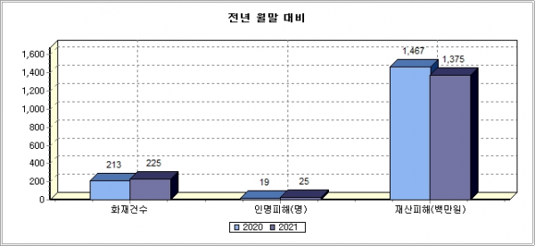 통계자료에 따르면 1분기 화재건수는 225건으로 지난해 213건 보다 12건, 인명피해는 25명으로 지난해 19명보다 6명이 증가했다.