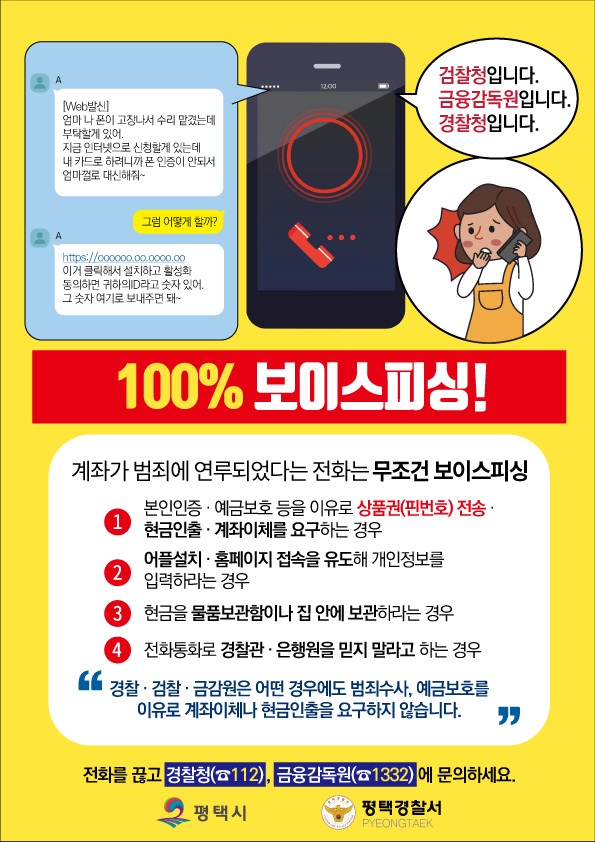평택시는 최근 코로나19 상황을 틈타 활개를 치고 있는 보이스피싱 및 스미스피싱 사고 피해 근절을 위해 23개 읍면동에 전광판 표출 및 현수막 게시, 민원실 홍보영상 상영, 홍보 전단지를 제작·배부하는 등 적극적인 예방 대책을 실시하고 있다.