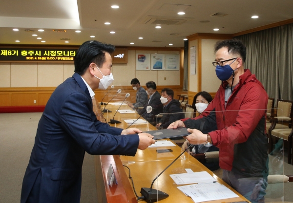 조길형 시장은 “제6기 시정 모니터는 ‘시민의 뜻과 더 가까운 충주’, ‘살고 싶은 도시 충주’를 만드는 데에 있어 중대한 역할을 해주실 것”이라며 “시민들의 생생한 목소리를 전달하는 대변자로서 능동적으로 활동해주기를 바란다”고 말했다.