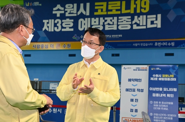 [충청뉴스큐] 수원시 예방접종추진단장인 조청식 수원시 제1부시장이 27일 수원 3·4호 예방접종센터가 설치된 수원종합운동장 내 수원국민체육센터, 수원청소년문화센터 꿈의 체육관을 잇달아 찾아 준비상황을 점검했다.