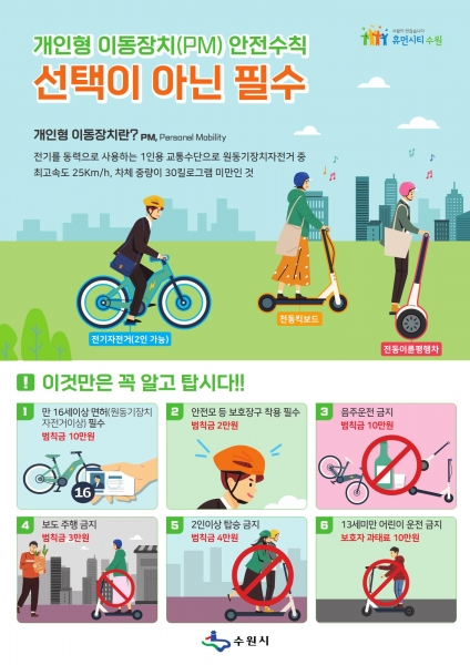 수원시는 오는 5월 13일 도로교통법 개정안 시행으로 PM 관련 규정이 강화되는 만큼 개정 사항을 적극 홍보하고 안전 문화 조성에도 박차를 가한다.