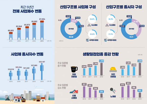 지난 2016년부터 2019년까지 4년 간 주요 업종별 증감 현황을 살펴보면, ‘음식점’과 ‘생활서비스업종’은 증가했고 ‘소매업’은 2018년을 기점으로 감소했다.